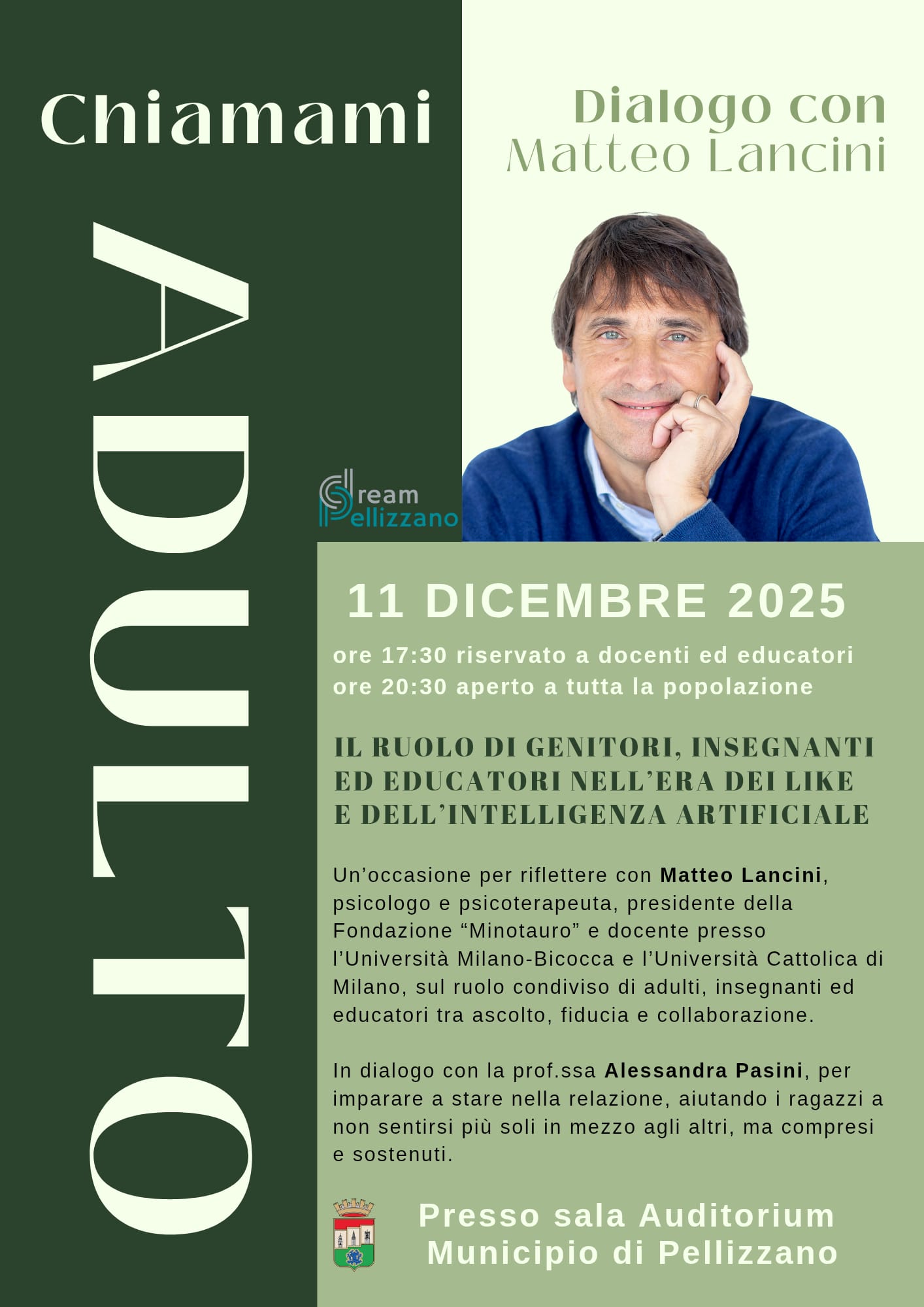 Crescere un ragazzo e una ragazza oggi è una responsabilità sempre più condivisa e la comunità educante ha quindi bisogno di momenti d’incontro e di confronto. La famiglia, la scuola e gli educatori sono sempre più chiamati ad affrontare difficili sfide educative che i nostri giovani vivono ogni giorno. Per questo l’Amministrazione Comunale di Pellizzano, in occasione dell’annuale incontro riguardante i temi dell’educazione, “Pellizzano Dream”, invita genitori, docenti e chiunque abbia a cuore l’educazione dei nostri giovani, ad un incontro con il dottor Matteo Lancini, psicologo e psicoterapeuta, docente universitario e autore di diversi libri dedicati alle problematiche legate all’educazione, l’ultimo dei quali “Chiamami adulto”. In dialogo con la professoressa Alessandra Pasini aiuterà a leggere il mondo interiore dei nostri ragazzi e delle nostre ragazze, un’occasione per trovare un linguaggio comune e costruire una rete educativa.