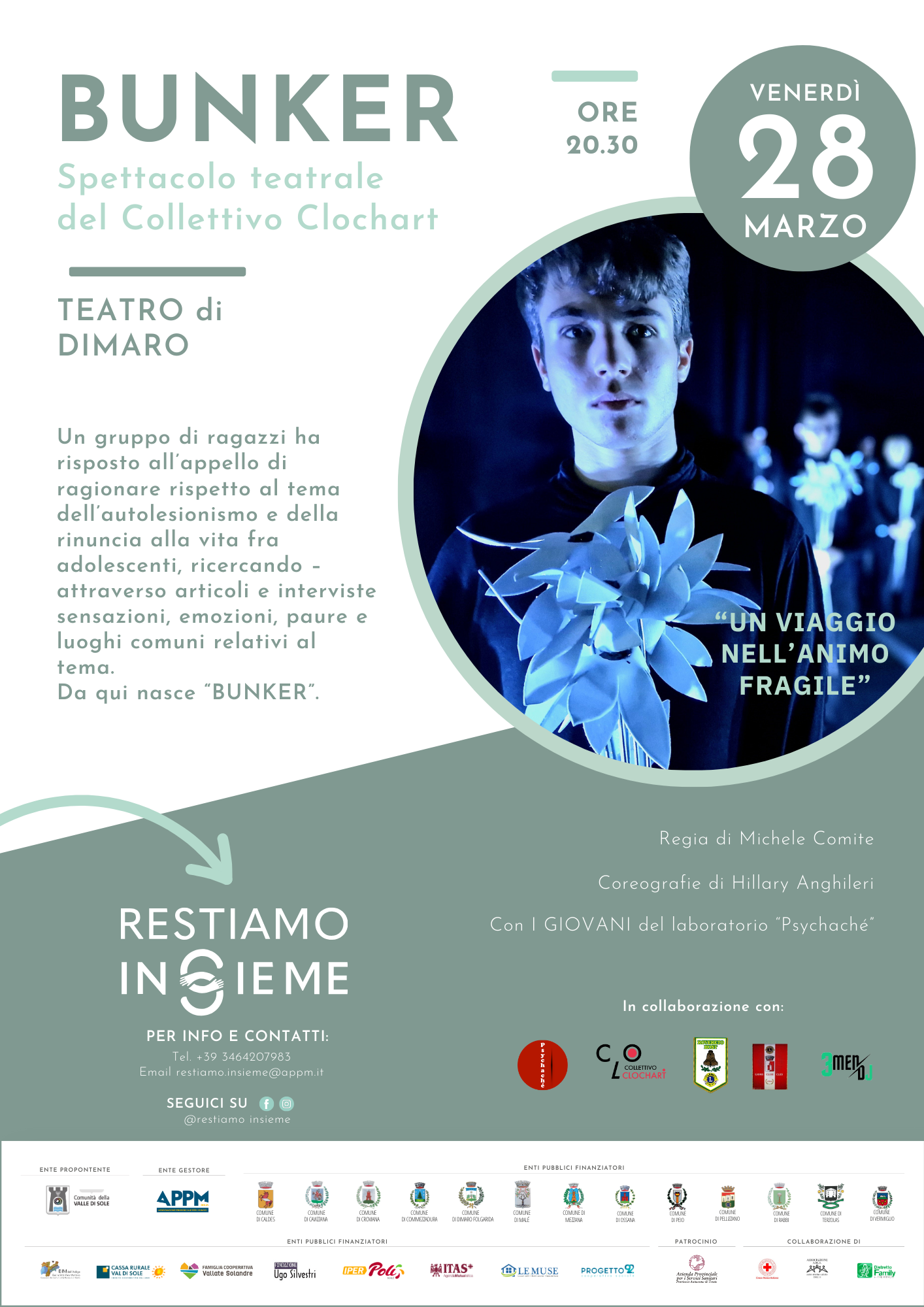 Un gruppo di ragazzi ha risposto all’appello di ragionare rispetto al tema dell’autolesionismo e della rinuncia alla vita fra adolescenti, ricercando – attraverso articoli e interviste sensazioni, emozioni, paure e luoghi comuni relativi al tema. Da qui nasce Bunker, uno spettacolo teatrale in cui i ragazzi stessi sono protagonisti sul palco.